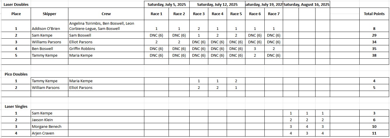 • The junior fleet races  from July thru August on Saturdays. We meet at the club to start rigging boats at 9:00am. The Skipper’s Meeting is at 10 inside the clubhouse to decide the course based on wind and conditions and if the race is a go or a no go. After the meeting we launch the boats and then get in as many races as we can! Hot dogs hamburgers and awards are after the race at the clubhouse, graciously funded by donations from our members.
